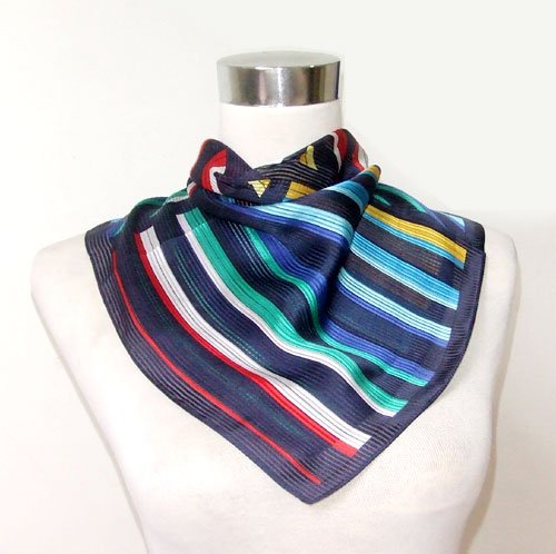 Chiffon/Satin Multicolored Strip Print on Dark Blue - Silk Bandana 21" x 21" Feature