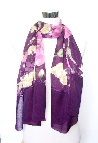 Chiffon/Satin Multicolored Floral Print on Deep Purple - Silk Long Scarf 20"x 64" Feature